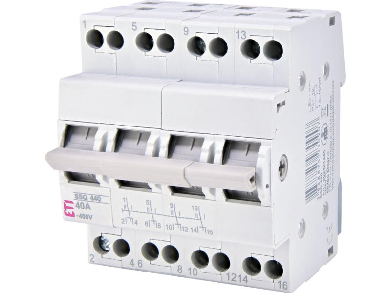 Skupinový přepínač ETI SSQ 440 je konstruován pro napětí 400V AC a proud 40A.